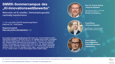 In den Plattformprojekten des Innovationswettbewerbs „Künstliche Intelligenz als Treiber für volkswirtschaftlich relevante Ökosysteme“ (KI-Innovationswettbewerb) werden KI-Lösungen mit hohem Disruptionspotenzial für wichtige Anwendungsdomänen der deutschen Wirtschaft entwickelt. Die angestrebten Lösungen für Produktion und Logistik, für den Handel, die Agrar-, Gesundheits- und Bauwirtschaft, den Finanzsektor, für Smart Living und das Krisenmanagement sollen am konkreten Bedarf und den Anforderungen der deutschen Wirtschaft und insbesondere des Mittelstands ausgerichtet sein. Eine Besonderheit des Programms stellt zudem das Thema Quanten-unterstützte KI dar. Ziel des vom Bundesministerium für Wirtschaft und Klimaschutz (BMWK) geförderten Technologieprogramms ist es, Voraussetzungen für die breite, wirtschaftliche Anwendung von KI zu schaffen und die Erschließung zukunftsweisender, KI-basierter Geschäftsmodelle zu befördern. Praktischer Nutzen, ökonomischer Mehrwert, Vertrauenswürdigkeit sowie Akzeptanz der Lösungen stehen dabei im Mittelpunkt des Sommercampus 2023.